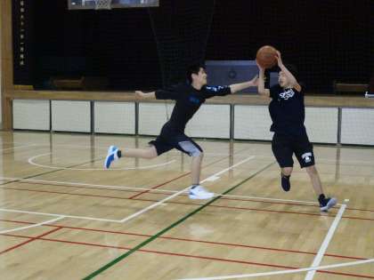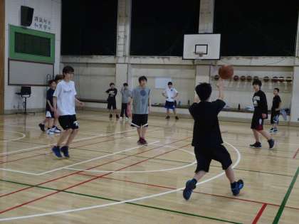 体育館で男子バスケットボール部が活動中です。パスを出してほしいタイミングできちんとキャッチボイスを出しましょう。(遠藤)