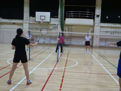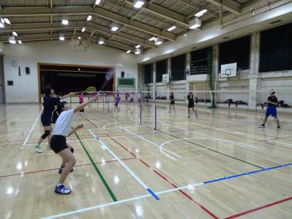 バドミントン部が体育館で活動しています。顧問の松本先生もラケットを握って、生徒たちと一緒にシャトルを打ち合っていますね。(遠藤)