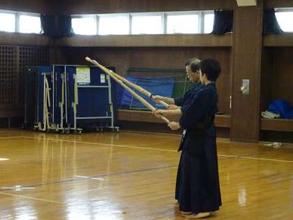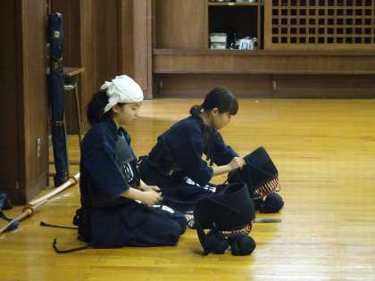 午前中、格技室では剣道部が活動しています。ちょうどこれから面をつけるところでした。防具をつけると気合が入りますね。(遠藤)