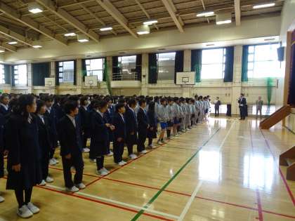 本日、全校朝会を行いました。1年生から3年生までそろって初めての全校朝会です。今年度の目標は8:25に整「列完了」ではではなく、8:25に「朝会を始める」です。全員で協力してすばやく整列しましょう。