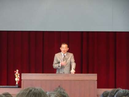 それでは、本題に入ります。本日の全校朝礼は全学年そろった最初の朝礼です。そこで、学期の始まりにあたってみなさんに今学期の重点テーマとなることについてお話しします。