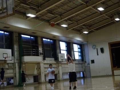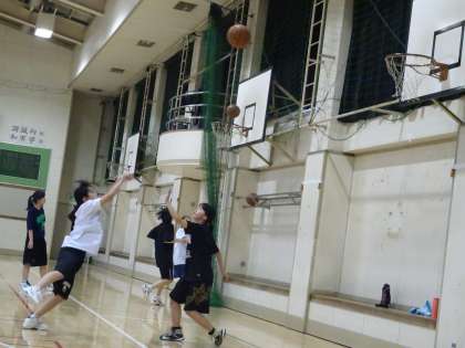 体育館で女子バスケットボール部が活動しています。1対1やフリースローの練習をしていました。(遠藤)