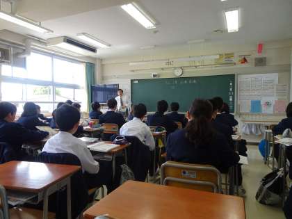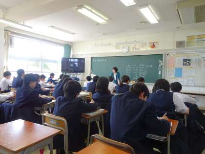 1年生の数学は少人数授業が始まっています。今日は、身の回りで「−」の符号がどんなときに使われているか学習しています。(遠藤)