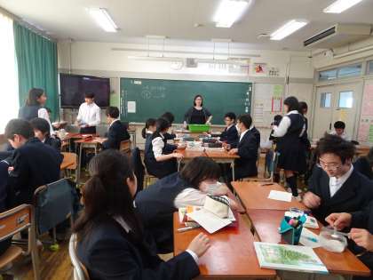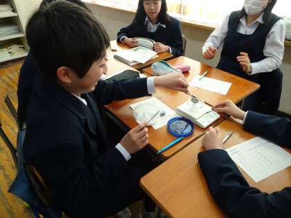 2年生の家庭科の授業の様子です。計量スプーンを使って塩を量り取る練習をしていました。(遠藤)