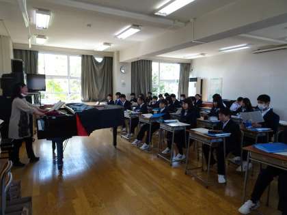 1年生の音楽の授業です。校歌の歌詞について学習しています。きちんと覚えて大きな声で歌えるようにしましょう。(遠藤)