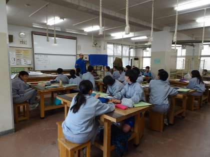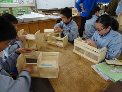 2年生の技術の授業です。昨年度組み立てた本棚を紙やすりで磨いていました。この後ウッドオイルを塗りますが、表面をていねいにきちんと磨いておかないときれいに光りません。人の心と同じですね。(遠藤)