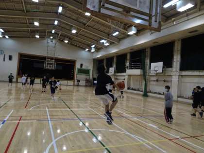 体育館でバスケットボール部が活動中です。新入部員も加わり夏季大会に向けてがんばっています。(遠藤)