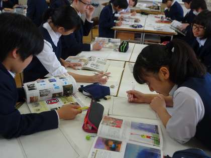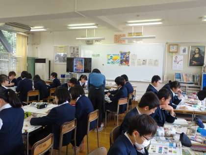3年生の美術の授業です。組み合わせ模写をしていました。校内作品展に展示される作品ですね。(遠藤)