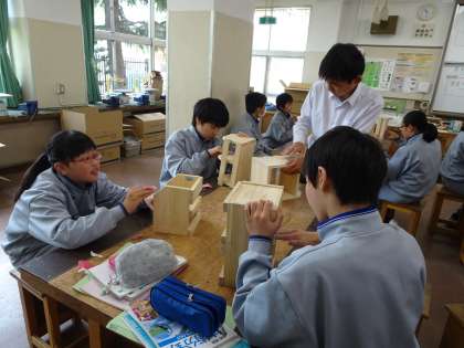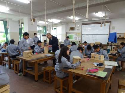 2年生の技術です。本棚を紙やすりで磨いていました。次回から塗装に入るようです。(遠藤)