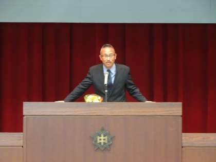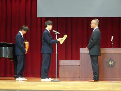 生徒たちから感謝の言葉と花束が渡されました。水田先生です。サッカー部の生徒が感謝の言葉を読みました。(遠藤)
