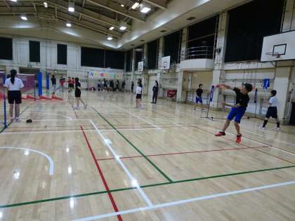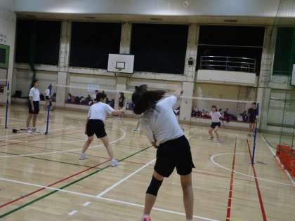 体育館ではバドミントン部が活動中です。日曜日の公式戦に向けて実戦練習です。男子部員もがんばっています。(遠藤)