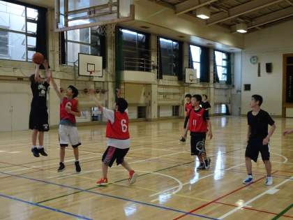 午後の体育館では男子バスケットボール部が活動しています。ゲーム形式の練習です。スクリーンや合わせの動きを使ってパスを回して攻めるようにしましょう。(遠藤)