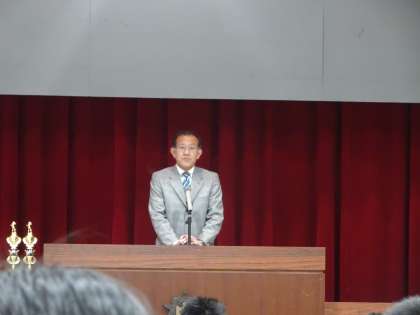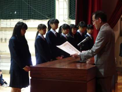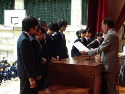 本日、全校朝会を行いました。校長先生のお話のあと、卓球部とバドミントン部の表彰がありました。(遠藤)