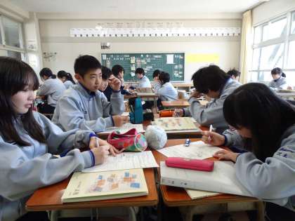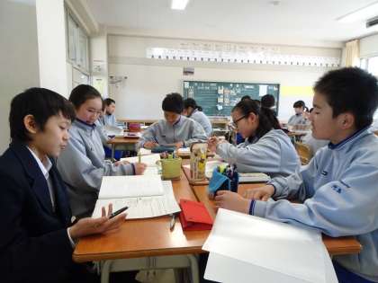 2年生の教科「日本語」ではグループ討論を行っています。討論のテーマは「中学校には、制服があった方がよい」です。賛成・反対の立場に立って討論を行っています。相手の意見をよく聴きましょう。また、自分の考えを明確に論理的に述べられるようにしましょう。(遠藤)