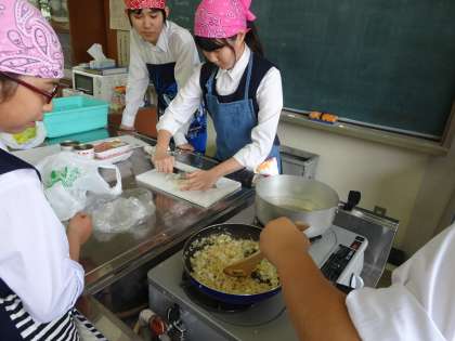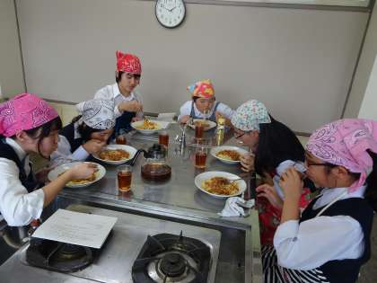 家庭科部が活動しています。今日はミートソースパスタです。玉ねぎをみじん切りにして炒めるところから作っていました。美味しくできたみたいですね。(遠藤)