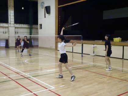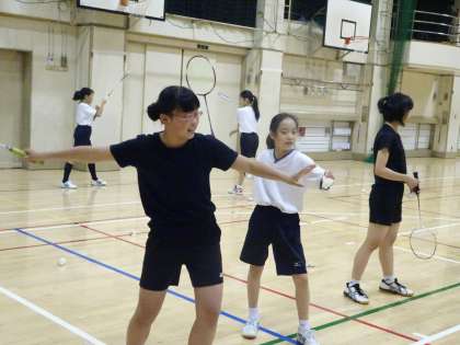 バドミントン部が16:10から体育館で活動しています。3年生は実践練習をしていました。2年生が1年生にサーブの打ち方やフォームを教えていました。(遠藤)