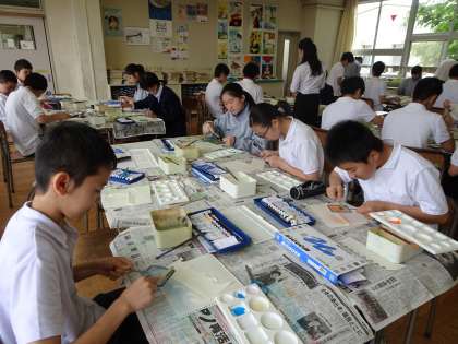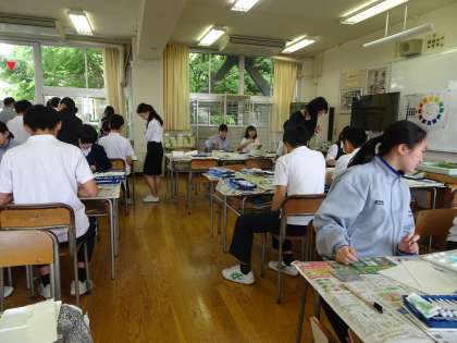 2年生の美術の授業では、スパッタリングを学んでいました。きちんと技法を身につけて他の作品を制作するときに活用できるようにしましょう。