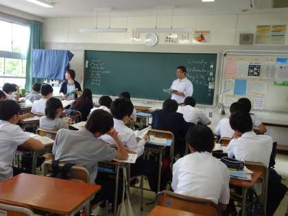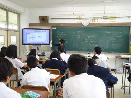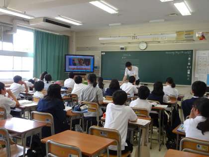 1年生の英語の授業です。ALTのダニー先生のネイティブな発音のあとに続いて発音していました。他のクラスはbe動詞について学習していました。(遠藤)