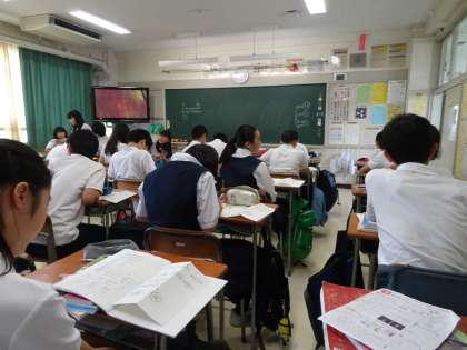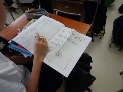 2年生の理科の授業です。原子の腕の数から化学式をつくっていました。(遠藤)