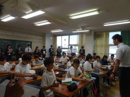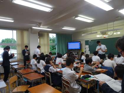 本日5時間目、英語科の片桐主幹教諭が初任者に向けての公開授業を行いました。授業後の協議会では、たくさんの質問が出ていました。(遠藤)