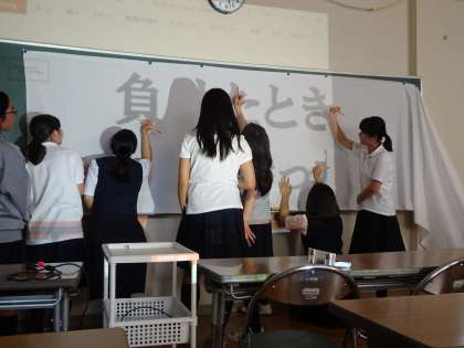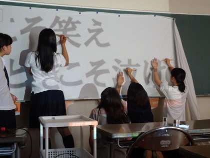 1,2年生の体育委員女子が運動会のスローガン横断幕の下書きを描いています。(遠藤)