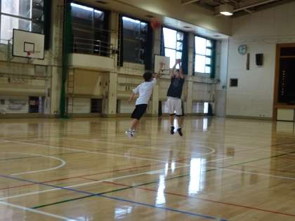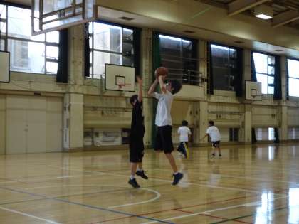 午後の体育館では男子バスケットボール部が活動しています。1対1でのディフェンスはワンアームでついていけるようにしましょう。(遠藤)