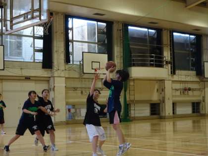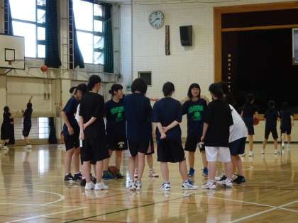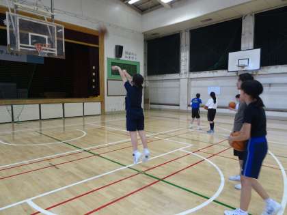 午後の体育館では女子バスケットボール部が活動しています。ドライブを仕掛けたときに足とボールを同時に止めないようにしましょう。1年生は基礎練習を繰り返してきちんと身につけましょう。(遠藤)
