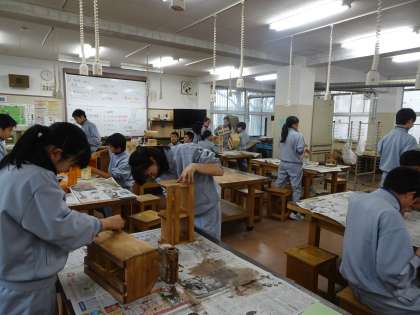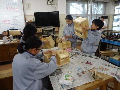 2年生の技術の授業の様子です。ウッドオイルを塗る作業もかなり進んできました。よく乾かしてから磨いていきましょう。(遠藤)
