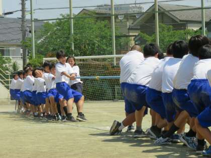 1,2校時の学年練習では、綱引きの練習をしました。今日はC組が勝ちました。(小林)