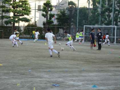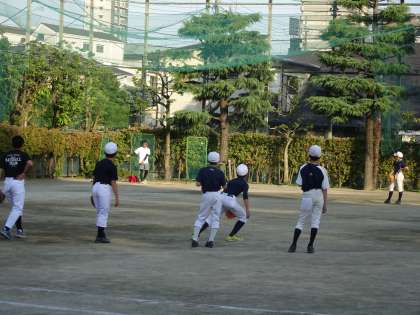 校庭では野球部とサッカー部が活動しています。野球部はフィールディング、サッカー部はパス交換しながらボールをキープする練習です。(遠藤)
