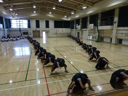 3年生の運動会学年練習の様子です。女子は校庭でダンスの立ち位置の確認をしていました。男子は体育館でソーラン節の練習です。(遠藤)