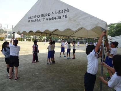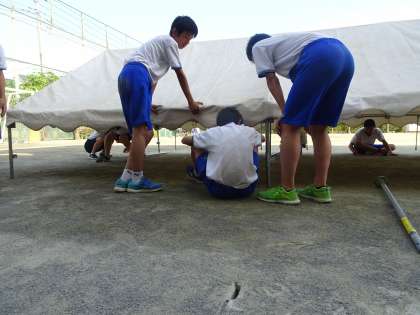 放課後、学級委員が明日の予行練習に向けてテントを張ってくれています。みんなテキパキと仕事をしてくれたのですぐに張り終えることができました。(遠藤)