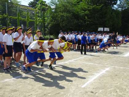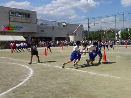 2年生のハリケーンのです。4人で力を合わせ、3つのコーンを回って戻ってきます。戻ってきたらクラス全員で協力して竹の棒を飛び越えなければなりません。クラスの団結力の見せ所です。(遠藤)