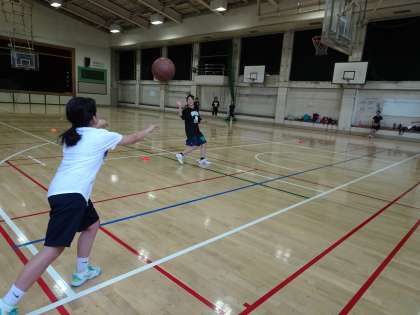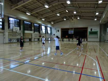 体育館では女子バスケットボール部が活動しています。今日からは1,2年生での練習です。チェストパスやワンハンドプッシュパスなどの基本的なパスの練習やスクエアパスの練習をしていました。(遠藤)