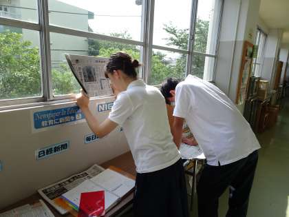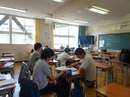 期末考査当日の朝の様子です。早めに登校して教室で勉強したり、新聞を見て社会のニュース問題の対策をしたりしています。(遠藤)