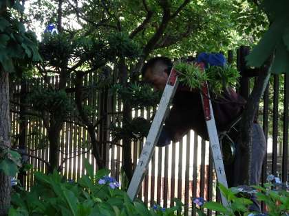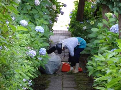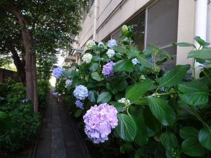 あじさい通りのあじさいがきれいに咲いていました。その奥では主事さんたちが枝の剪定や掃除をしてくれていました。いつも校内をきれいにしていただき、本当にありがとうございます。(遠藤)