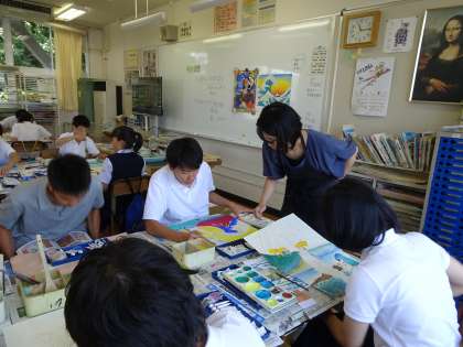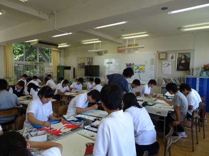 3年生の美術の授業です。組み合わせ模写の色塗りに入っていました。影や模様は細かいタッチで重ねて描いていきましょう。(遠藤)