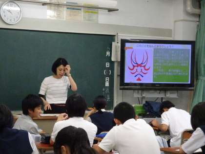 3年生の教科「日本語」では、歌舞伎の隈取りについて学習していました。隈取りの色は役柄によってことなります。赤は勇気、正義、強さをもった役。青は敵役に使用されます。(遠藤)