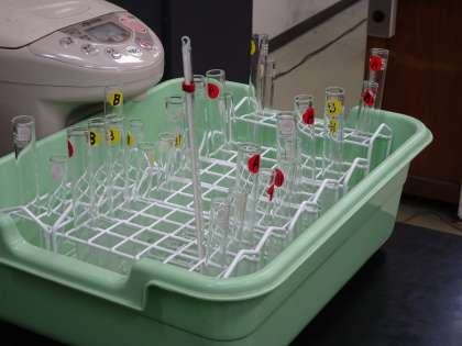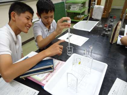 2年生の理科の授業の様子です。だ液のはたらきの実験です。デンプンがだ液のはたらきによってどう変化するのかを確かめましょう。(遠藤)