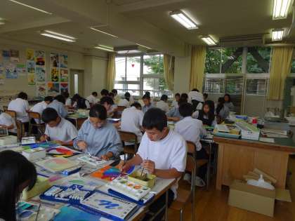 1年生の美術の授業の様子です。グラデーションの色塗りです。今日が作品提出の締め切りのようです。きれいに仕上げましょう。(遠藤)