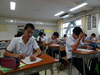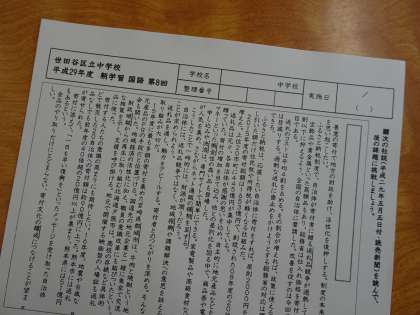 金曜日は朝読書の時間を利用して、新聞の社説を読み、その要約をしたり、自分の意見を書いたりする練習をしています。(遠藤)