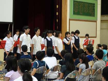 今日は小学生体験入学・新入生保護者説明会です。体育館では生徒会歓迎セレモニーが行われています。生徒会本部役員の自己紹介の後、校長先生からのお話がありました。(遠藤)
