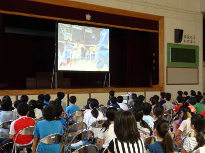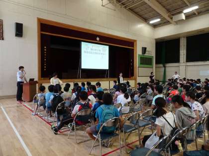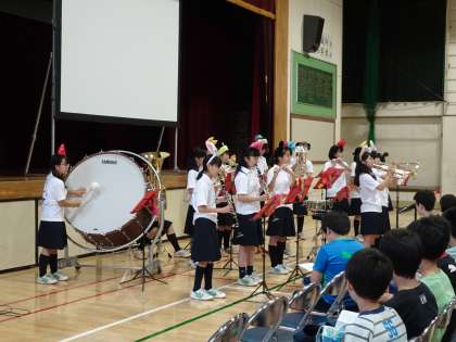 校長先生のお話の後は、吹奏楽部の演奏、学校紹介ビデオの上映です。この後、仮担任の先生と教室に向かい授業体験になります。(遠藤)