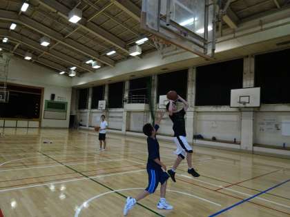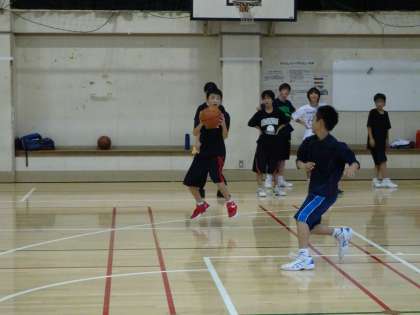 15時から体育館では男子バスケットボール部が活動しています。Vカットやスクリーンをつかってマークマンをずらしてフリーでパスがもらえるようにしましょう。(遠藤)
