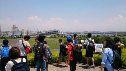 屋上庭園からは東京湾が一望できます。これからアスレチックに向けて移動します。(校長)