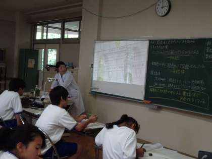 1年生の理科の授業です。BTB溶液の色の変化について学習していました。酸性、中性、アルカリ性で色がどう変化するのかきちんと覚えましょう。(遠藤)