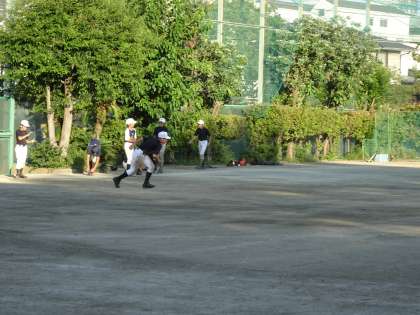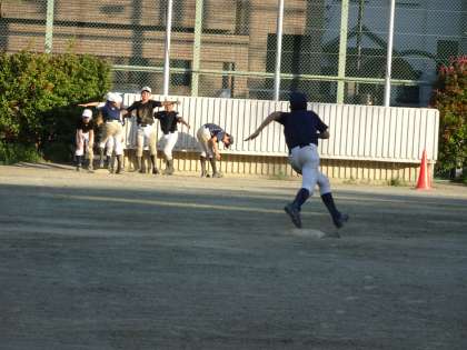 校庭では野球部が活動しています。ベースランニングの練習です。ベースを回るときは重心を内側にかけ内側の足でベースを踏むようにしましょう。(遠藤)