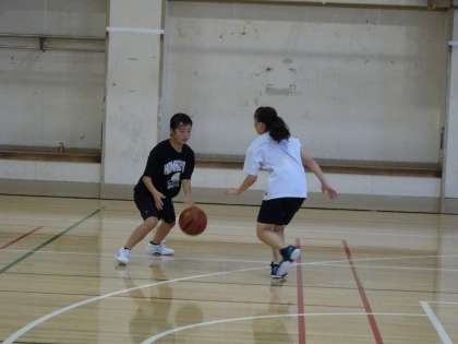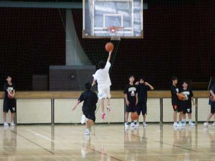 体育館ではバスケットボール部が活動中です。1対1練習です。ディフェンスはワンアームでつきディレクションをして中に行かせないようにしましょう。(遠藤)