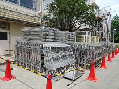 東校舎の窓枠改修が始まりました。工事をするための足場を設置しています。開放門の近くには資材が置かれています。登下校時や休み時間にその付近を通るときは注意して通るようにしましょう。(遠藤)