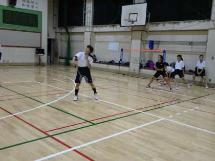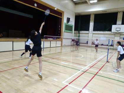 体育館ではバドミントン部が活動しています。2年生はダブルスの練習、1年生は基礎打ちの練習をしていました。(遠藤)